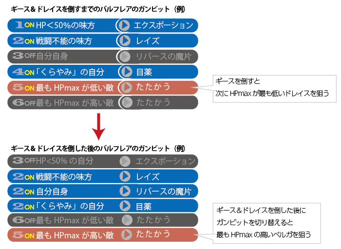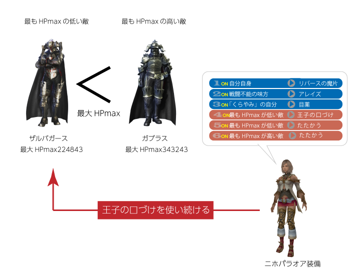 ベルガを倒せたら、いよいよ敵は2人に絞られます。しかし、ガブラスとザルバガースは相互回復の循環体なので、防止対策を練らないと、どちらかのHPを削っても延々とエリクサーで回復されてしまいます。そのため行うのが、ザルバガースを睡眠状態にしてガブラスへの回復を防ぐことです。ですので、ガブラスはザルバガースより先に倒しますが、倒す前にザルバガースの睡眠状態にしなければなりません。誰か1人にニホパラオアを装備させ、手動で王子の口づけを投げるのもありですが、ガンビットに組み込んで睡眠状態にすることもできます。その場合は、ガブラスよりもHPmaxが低い敵ですので、「最もHPmaxが低い敵→王子の口づけ」です。その代わり、そのガンビットを組んだメンバーは、最後までザルバガースに王子の口づけを使い続けるので、ガブラスを倒せたら、ガンビットはオフにすると良いでしょう。