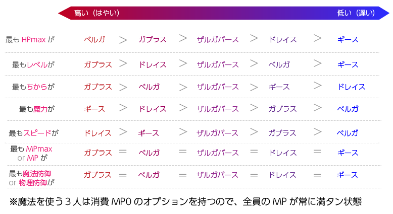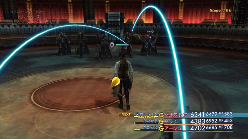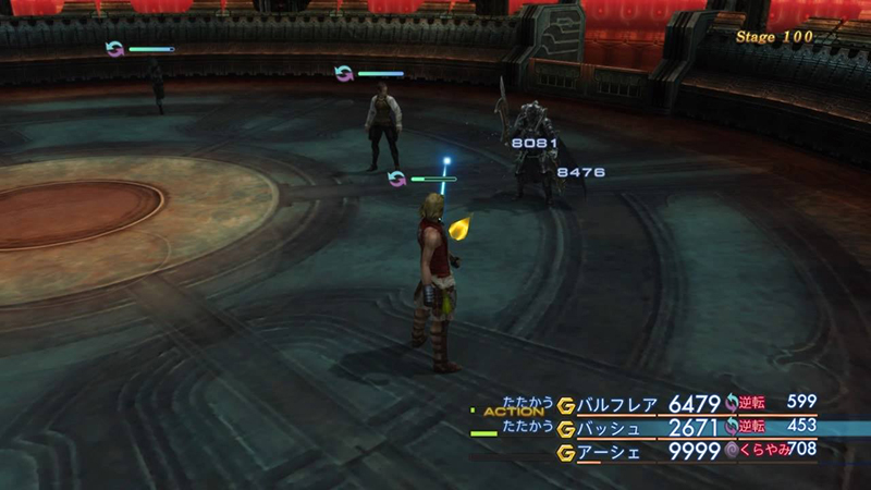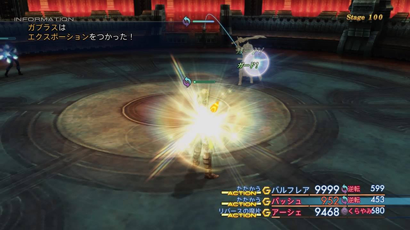 ジャッジマスターは、各ジャッジのHPが減ると減ったHPをエリクサーで全回復してしまう、というガンビットを組んでいます。まずはじめに、それぞれのエリクサー使用行為が3パターンに分かれているのがわかります。ガブラス、ザルガバース、ドレイスはひとつの循環したユニットで、それぞれの行動が連携しています。各ガンビットは、例えばガブラスならHP<50%のドレイス→エリクサー、HP<50%のザルガバース→エリクサーとなり、他の二人も各循環した味方に対し、HP<50%の味方→エリクサーとなり、ほぼこのガンビットが優先的に使用されることが推測されます。ただし彼らは彼らのユニットに属した味方を回復することができても、自分自身は回復することができません。一方、このユニットに属さない他2人、ギースとベルガは、それぞれが独立した単体で、ギースは自分自身のHPのみエリクサーで回復可能。一方、ベルガは味方はおろか、自分自身をも回復することができません。味方からエリクサー回復をされることはなく、HP20%の自分→エリクサーのガンビットを優先的に行う。こういったジャッジ達のエリクサー回復システムを知り、ステージ100を攻略しましょう。