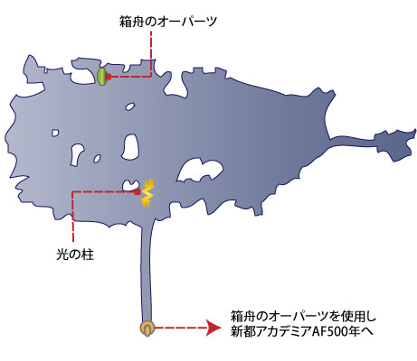 19、箱舟のオーパーツを使用して、ゲートから新都アカデミアAF500年へ移動する。