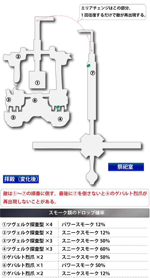 その場合は、隣りのエリア「祭祀室」とのエリアチェンジで敵再出現可能になる。